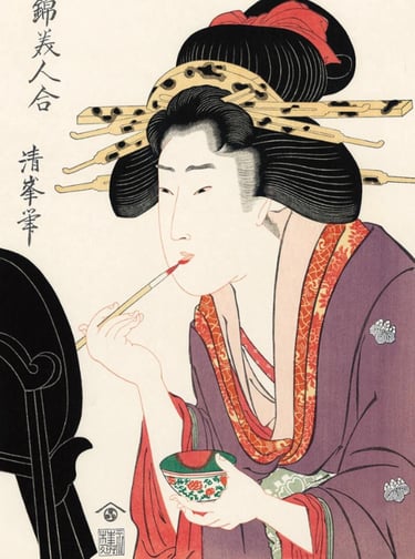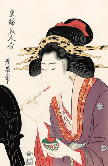 Japonya’nın kozmetik tarihi için Antik Mısır kadar eskilere gidemesek de 1600’lü yıllardan itibaren kaynaklara ulaşılıyor. O zamanlarda makyaj kadınların toplumdaki yeriyle ve nezaketiyle doğrudan alakalıydı. Kadınların nasıl olmaları gerektiğini anlatan eğitim kitaplarından, üç renkten oluşan makyaj paletleri gibi sıklıkla kullanılan dönemin uygulamalarını biliyoruz. Bu renkler siyah, beyaz ve kırmızıydı. Kırmızı rengini allık ve dudak boyası için, siyah rengini kaşlar ve dişler için, beyaz rengini ise pudra olarak kullanıyorlardı. Evlenen kadınlar dişlerini siyaha boyar, çocukları olunca da kaşlarını kazırlardı. Bu yüzden kazıdıkları kaşlarını ve dişlerini siyaha boyarlardı. Bu dişlerini siyaha boyama işlemine “Ohaguro” denirdi. Beyaz tenin onlar için önemini anlatmak yerine eski bir atasözünü buraya bırakmak istiyorum: “Beyaz ten yedi kusuru örter.” Nitekim bu anlayışla yüzlerini daha beyaz yapabilmek için cıva ve kurşun içeren pudraları kullanırlardı.