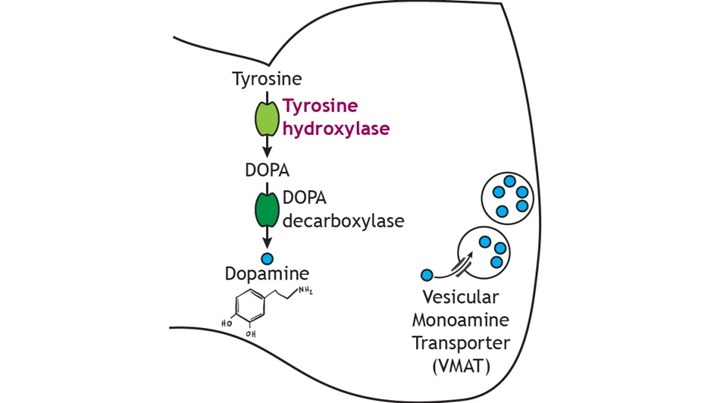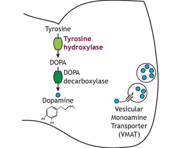 Dopamin, beyinde sentezlenen temel bir nörotransmitterdir. Nörotransmitterler sinir sistemimizde, sinir hücreleri arasında mesajları ileten kimyasal habercilerdir. Dopaminin sentezi ise tirozin adlı aminoasit ile başlar ve tirozin hidroksilaz enzimi ile L-DOPA’ya dönüştürülür. L-DOPA ise L-Amino Asit Dekarboksilaz (AADC) ile nihai ürün dopamine dönüşür.